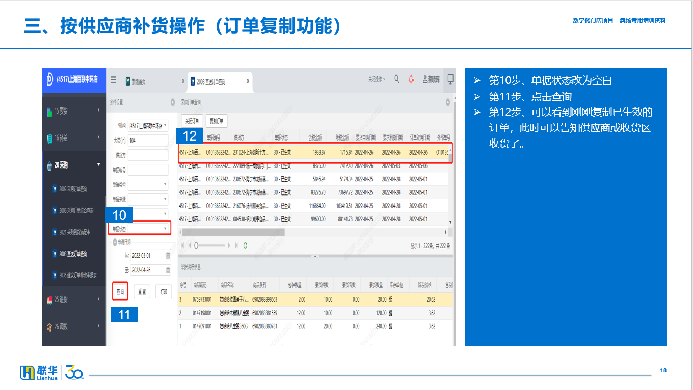 目录 搜索 模块操作手册01 主档ISCS_0103 商品查询ISCS_0105批量操作ISCS_0115 类别管理ISCS_0120 标签管理ISCS_0135 供应商查询ISCS_0136 订货参数维护ISCS_0138 排面参数维护ISCS_0125 收银员ISCS_0140 团购客户维护ISCS_0151 商品管理ISCS_0160 供应商管理ISCS_0137 订货参数查询ISCS_0145 产地修改ISCS_0155 排面参数查询ISCS_0165 标签批量维护ISCS_0170 渠道商品信息ISCS_0175 线上分类商品03 配方ISCS_0320配方维护iscsISCS_0330 配方原料成本查询ISCS_0325产能维护iscs05 营运ISCS_0502 普通促销ISCS_0503 临保促销ISCS_0505 特殊促销ISCS_0504 普通变价ISCS_0507 价格变动查询ISCS_0510 牌卡打印ISCS_0515 限量使用ISCS_0520 PLU导出ISCS_0521 追溯码维护ISCS_0525 数据同步ISCS_0568 价格轨迹查询ISCS_0571 收银操作日志查询ISCS_0555 竞争价ISCS_0588 关账确认ISCS_0560 特殊促销查询ISCS_0570 收银录入ISCS_0573 每日高销量预警报表ISCS_0575 零库存缺货原因报表ISCS_0580 普通促销V2ISCS_0508 促销终止ISCS_0565 临保促销查询ISCS_0569 牌卡价格变动查询ISCS_0590 收银设备查询10 销售ISCS_1001 销售单据ISCS_1002 交易小票ISCS_1005 商品排行ISCS_1006 单品销售ISCS_1010 支付排行ISCS_1020 分类销售ISCS_1025 时段销售ISCS_1035 收银查询.ISCS_1040 交易流水.ISCS_1061 批发团购ISCS_1065 香烟销售ISCS_1071 收银日结单ISCS_1072 收银实收单ISCS_1075 收银日期汇总ISCS_1087 实时销售汇总ISCS_1088 日结销售汇总.ISCS_1089 线上订单查询ISCS_1073 门店收银日期汇总ISCS_1080 单店日销售查询ISCS_1085 销售拣货查询V2ISCS_1092 后台销售iscs12 履约1201 履约管理1202 履约任务面板1210 订单履约综合管理15 要货ISCS_1502 补货计划ISCS_1553 自动补货审批ISCS_1554 自动补货审批V2ISCS_1565 手工补货V2ISCS_1566 按供应商补货ISCS_1555 自动补货历史查询ISCS_1503 缺货报表查询ISCS_1567 补货计划查询V216 补差ISCS_1601 补差申请V220 采购ISCS_2002 采购订单查询ISCS_2003 直送订单查询ISCS_2006 采购订单综合查询ISCS_2021 采购到货满足率ISCS_2035 建议订单修改率报表25 进货ISCS_2500 出入库单据查询ISCS_2502 指令单据查询ISCS_2506 订单进货ISCS_2511 配送进货ISCS_2518 特殊直接进货ISCS_2540 赠品进货ISCS_2545 出入库单据审核ISCS_2550 进货单据查询ISCS_2551 进货单据汇总查询ISCS_2555 配送到货差异查询ISCS_2560 联营进货V2ISCS_2563 预检录入V2ISCS_2565 按订单进货V2ISCS_2570 配送进货V2ISCS_2526 直接进货V226 调拨ISCS_2605 调入申请ISCS_2606 调出申请ISCS_2607 调入审核ISCS_2608 调出审核ISCS_2618 调拨状态ISCS_2620 单向调出申请30 退货ISCS_3036 订单退货ISCS_3041 直接退货ISCS_3046 配送退货ISCS_3051 调拨出库ISCS_3006 退货申请ISCS_3002 清场商品查询ISCS_3050 退货申请V2ISCS_3053 退货通知单查询ISCS_3052 出库指令查询ISCS_3055 按订单退货V2ISCS_3065 退货装箱ISCS_3070 退货装箱对照ISCS_3075 退货交接ISCS_3060 直接退货V235 盘点ISCS_3531 盘点设置ISCS_3532盘点商品清单ISCS_3535实盘维护ISCS_3536 盘点扫描记录ISCS_3538 实盘调整ISCS_3540 盘点差异报告ISCS_3550 盘点报告(含月盘)ISCS_3555 实盘数据导出ISCS_3560 盘点切换数据ISCS_3565 大类盘点报告ISCS_3570 未上架商品查询ISCS_3575 盘点汇总差异报告 40 库存ISCS_4065 库存状况汇总.ISCS_4066 供应商库存状况ISCS_4067 供应商库存状况ISCS_4068库存明细查询ISCS_4069 库存流水ISCS_4080 库存检查ISCS_4007 损溢作业ISCS_4008 加工作业.ISCS_4009 换货作业ISCS_4011 耗材领用ISCS_4018 移库作业ISCS_4019 补损作业.ISCS_4022 赠品补损ISCS_4075 加工单据查询ISCS_4076 库存调整单据查询.ISCS_4077 库存调整明细查询ISCS_4078 库存调整汇总查询ISCS_4072 库存三级账ISCS_4016 扣补单作业ISCS_4017 串货作业ISCS_4031 损溢作业V2ISCS_4033 赠品补损V2ISCS_4073 单品库存变动查询ISCS_4082 不可售库存维护ISCS_4092 备用库存维护ISCS_4095 特殊换货作业ISCS_4096 联营库存处理90 财务ISCS_9001 类别销售日报ISCS_9015 销售毛利日报表ISCS_9020 单品进销存日报表ISCS_9021 单店进销存汇总报表SAAS_9001 销售日报SAAS_9005 进销存日报SAAS_9010 销售税务日报SAAS_9015 商品毛利报表SAAS_9020 商品进销存日报表ISCS_9060 单品损溢原因报表ISCS_9065 单品损溢毛利报表ISCS_9070 财务损耗报表98 监控ISCS_9830要货订货传输查询11 合同ISCS_1110 合同条款查询ISCS_1113 未结算数据查询ISCS_1115 已结算数据查询ISCS_1118 结算日志查询ISCS_1120 财务月度查询用户操作手册新增商品要货进货盘点卖场操作手册培训资料更新日志01主档0103商品查询0115类别管理0125收银员0135供应商查询0137订货参数查询0136订货参数维护0138排面参数维护0140团购客户维护0145产地修改0155排面参数查询0165标签批量维护03配方0320配方维护iscs05营运0502普通促销0503临保促销0504普通变价0505特殊促销0510牌卡打印0520PLU导出0521追溯码维护0525数据同步0588关账确认0560特殊促销查询0568价格轨迹查询0570收银录入0580普通促销V20508促销终止0565临保促销查询0569牌卡价格变动查询手持临保操作培训资料10销售1005商品排行1010支付排行1002交易小票1006单品销售1020分类销售iscs1025时段销售iscs1035收银查询1040交易流水iscs1061批发团购1071收银日结单1087实时销售汇总1088日结销售汇总15要货1566按供应商补货V21555自动补货历史查询1554自动补货审批V216补差20采购2002采购订单查询2003直送订单查询2006采购订单综合查询25进货直送配送收货2563预检录入2563预检录入(新)2560联营进货V22540赠品进货中仓常温无纸化收货26调拨30退货中仓退货直送供应商退货中仓退货