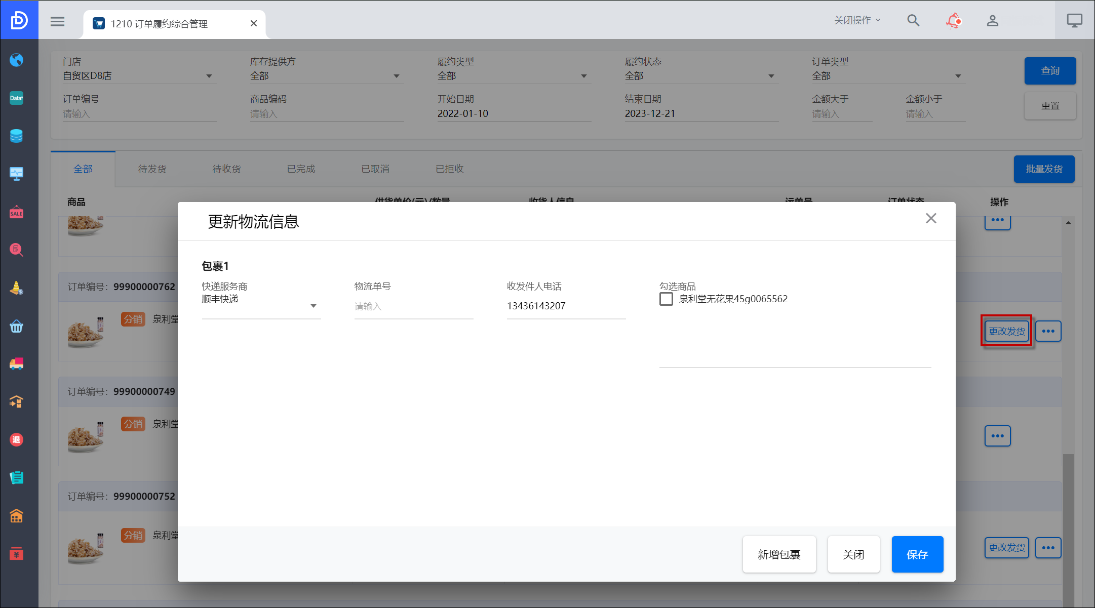 【更改发货】:仅已发货状态的订单有【更改发货】的按钮,用于更改物流单号;