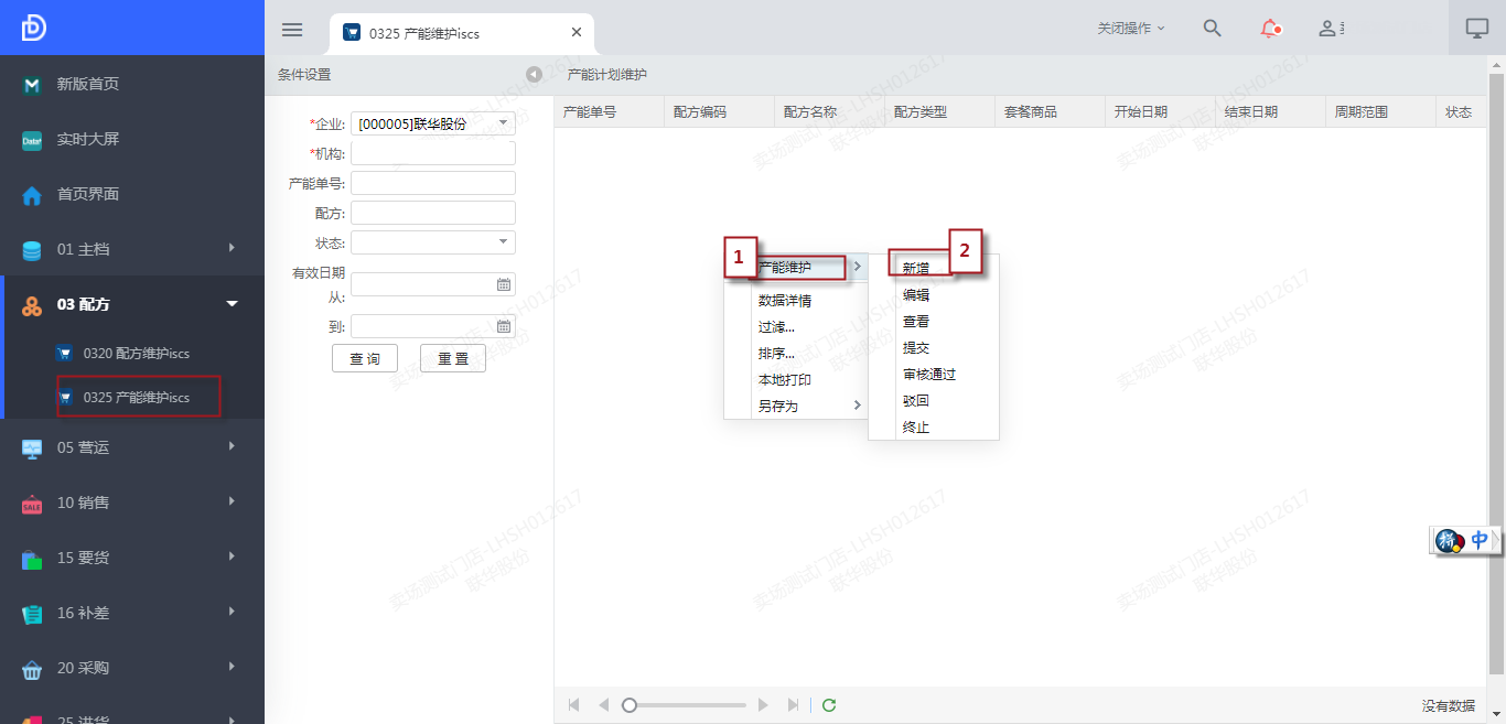 1【右键产能维护】→2【新增】→3【选择配方号码】→4【输入产能数量】→5【输入时间周期】→6【保存】→7【查询】→8【提交】→9【审核通过】