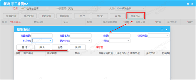 铵钮,系统会弹出一个新的商品查询页面,根据查询条件可快速定位到所需商品,可批量选择商品插入进要货商品清单页面,详细页面如下图;