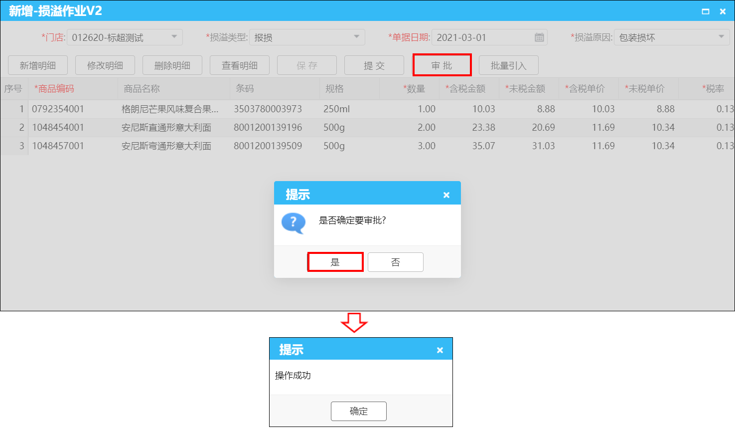 损溢作业操作步骤:1打开【损溢作业V2】→2【新增】→3维护单据概要信息(损溢类型、损溢日期(默认当天)、损溢原因)→4新增明细(三种方式)→5【保存】→6【提交】→7【审批】;如下图
