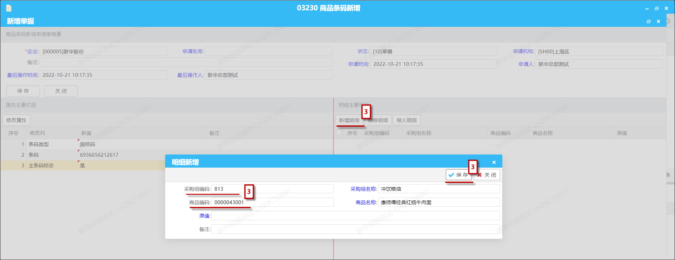 【1】新增→【2】依次维护条码类型、条码、主条码标志→【3】新增明细,输入采购组编码及商品编码并保存→【4】保存并依次、提交、审批通过