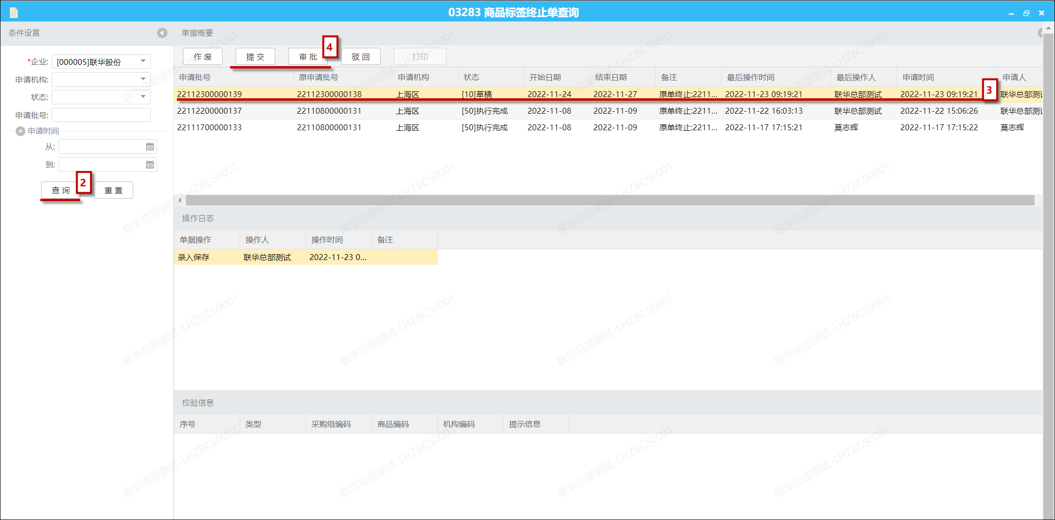 同明细页面中的“审批”功能,只有状态为提交的单据才可以审核通过,同时只有审核通过的单据才会生效;