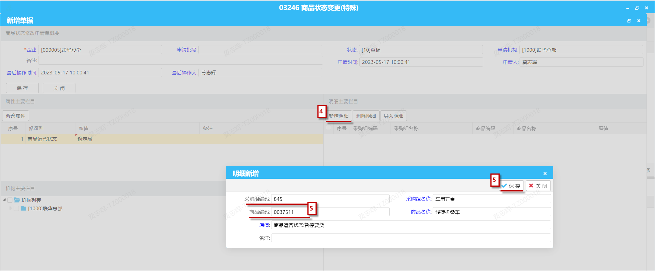 【1】新增→【2】选中商品运营状态并点“修改属性”按钮→【3】录入新值并保存→【4】新增明细→【5】填入采购组编码与商品编码并保存→【6】选择机构→【7】依次保存、校验、提交、审批通过