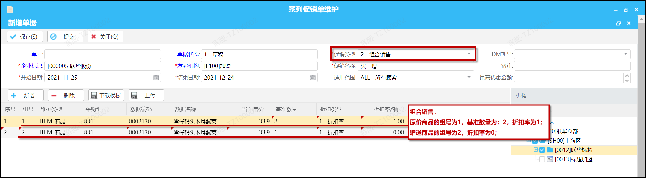 促销类型:组合销售;维护类型:ITEM-商品;数据编码:输入商品编码;原价商品的组号为1,基准数量为:2,折扣率为1;赠送商品的组号为2,折扣率为0;页面截图如下: