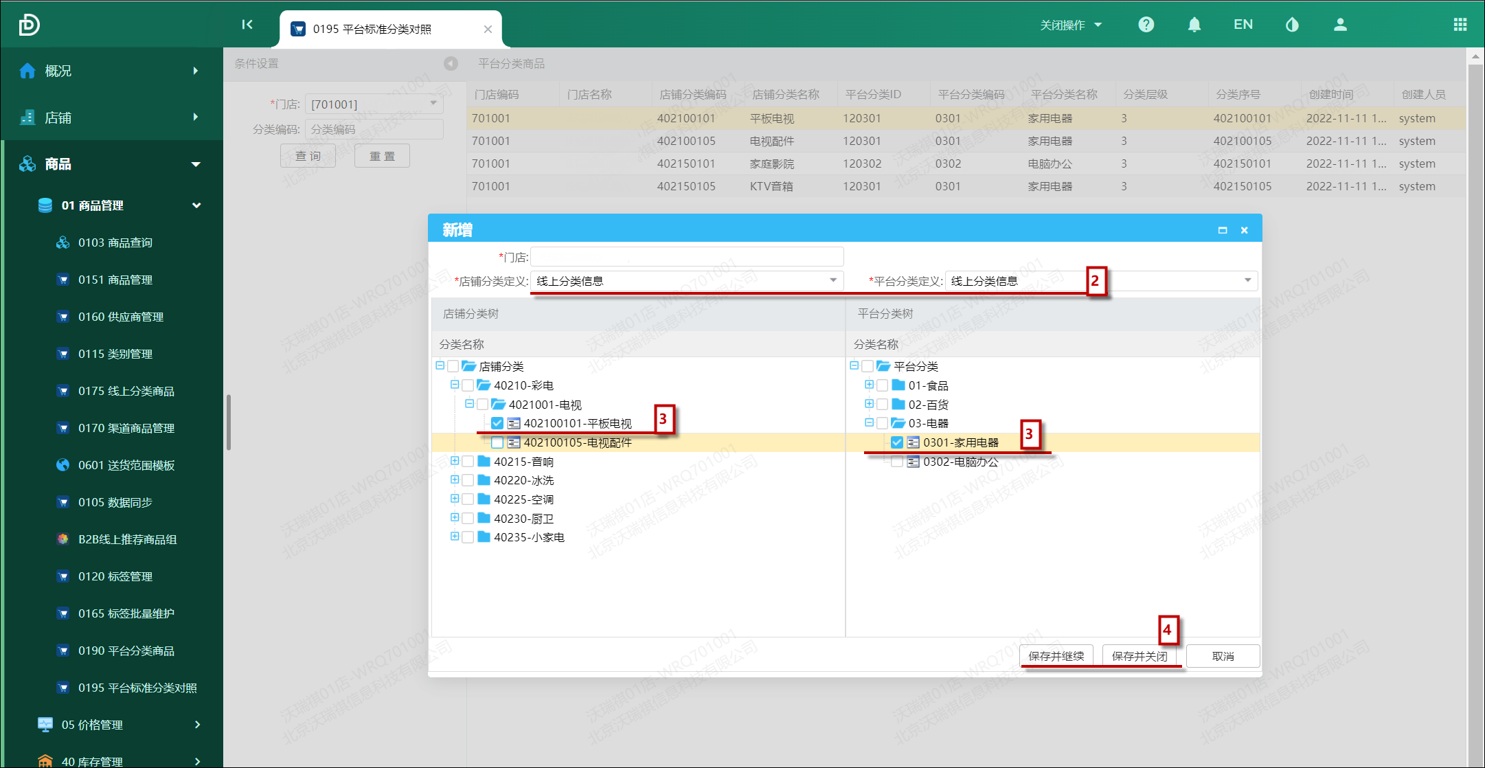 【1】鼠标右击选择“上架平台–新增”→【2】确认店铺分类定义及平台分类定义→【3】勾选店铺分类名称及平台分类名称→【4】保存并继续/保存并关闭